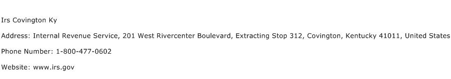 and Address is Internal Revenue Service, 201 West Rivercenter Boulevard, Extracting Stop 312, Covington, Kentucky 41011, United StatesInternal Revenue ServICE Covington, KY is the federal Government agency and is part of the Treasury department of the Country. The agency works under the Directions of Commissioner of Internal Revenue. IRS collects taxes and enforcement Internal Revenue Law in the State. Headquartered in Washington, Internal Revenue ServICE has established ten servICE centers across the Country. The centers perform the actual tax processing.
