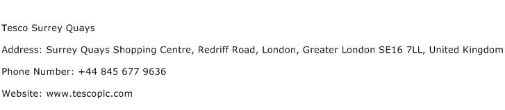 The contact number of Tesco Surrey Quays is +44 845 677 9636.Email Address of Tesco Surrey Quays